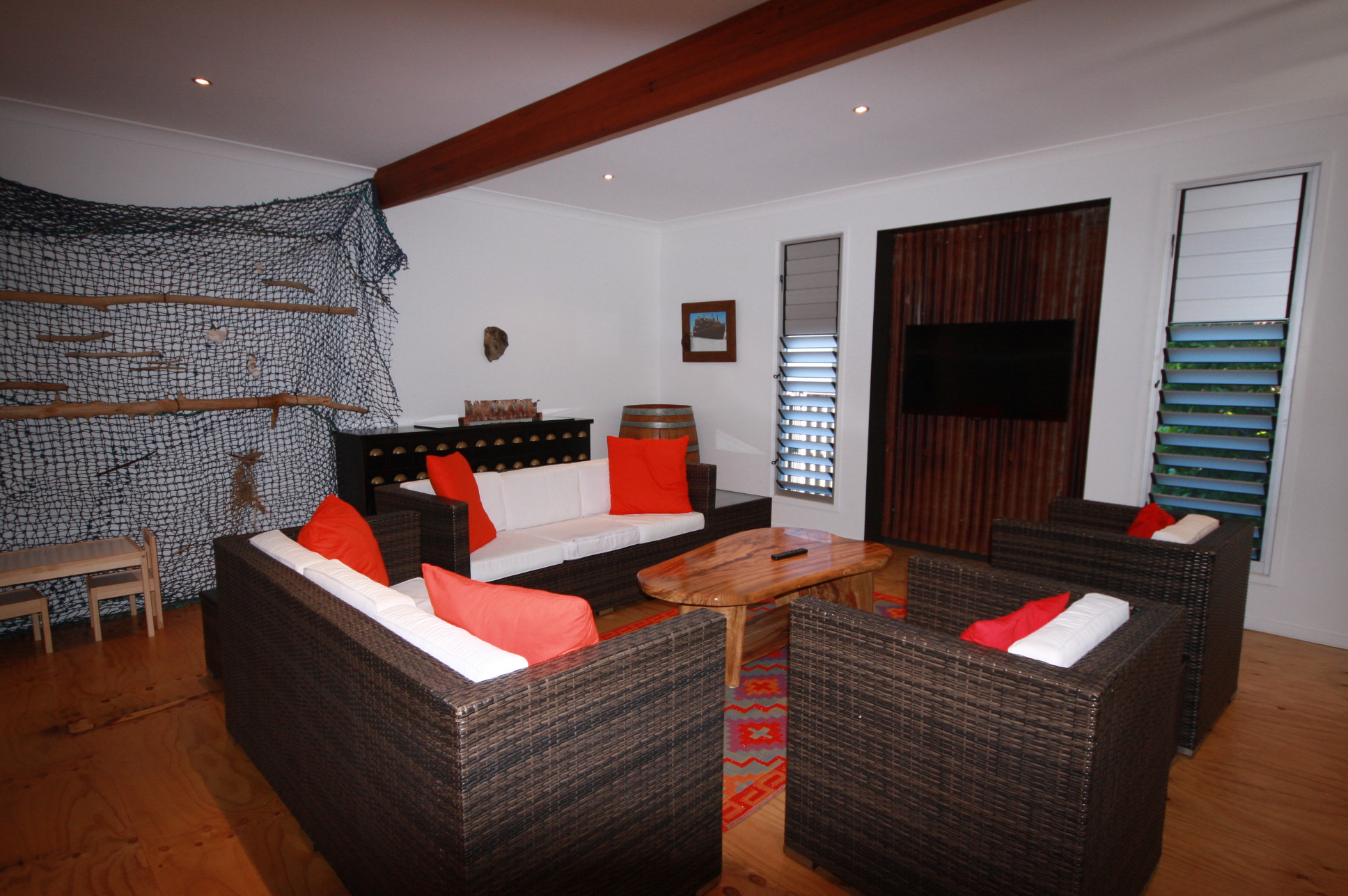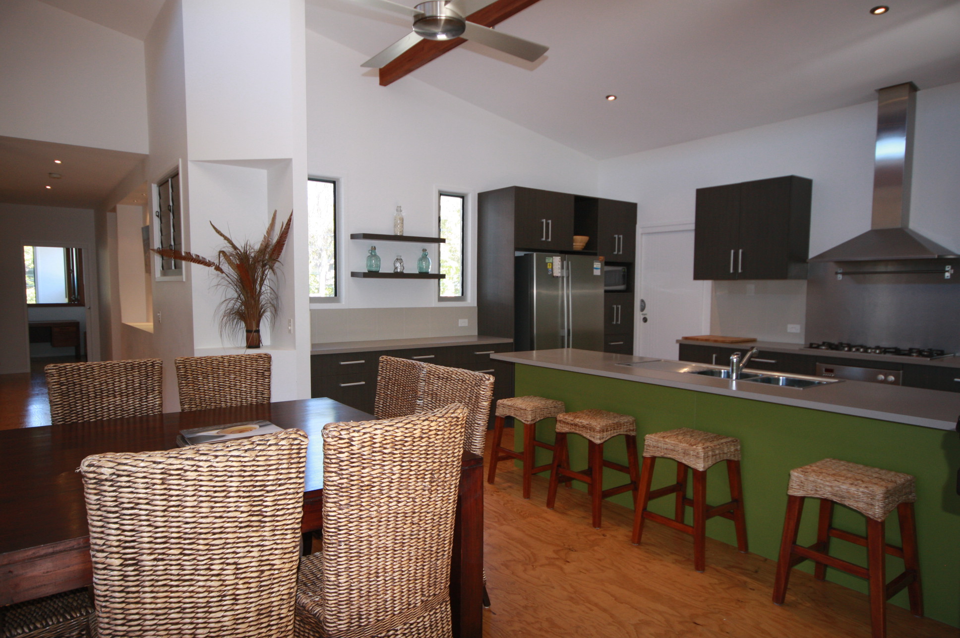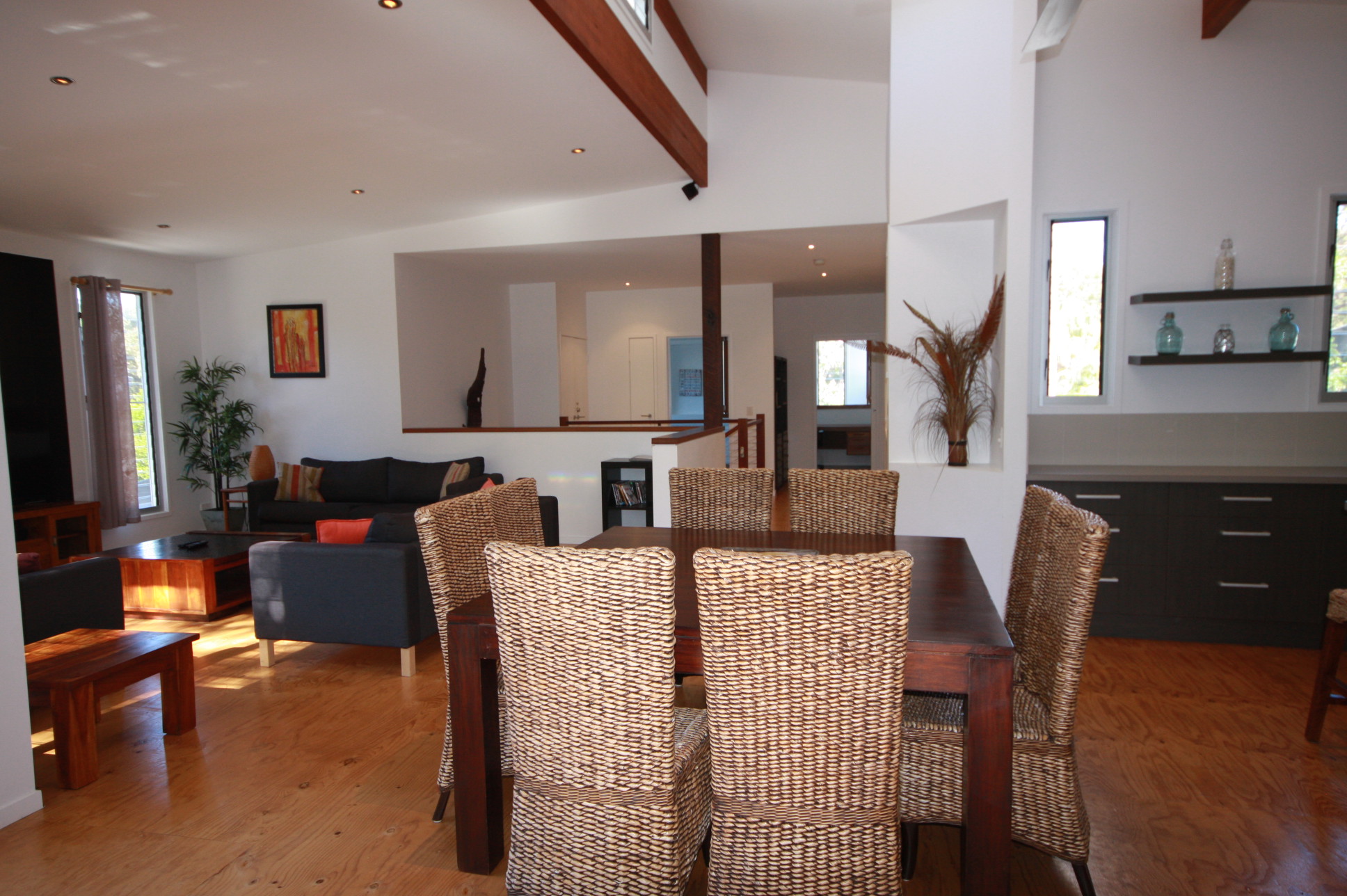 This is truly a magnificent holiday home. Melaleuca Beach House is a tranquil, peaceful place, which you will find hard to leave. The 'Melaleuca' is a native paper-bark tree found in the natural bushland of Rainbow Shores and surrounds the rear of the house. This property has been designed to capture the magic of these beautiful trees and beach setting.