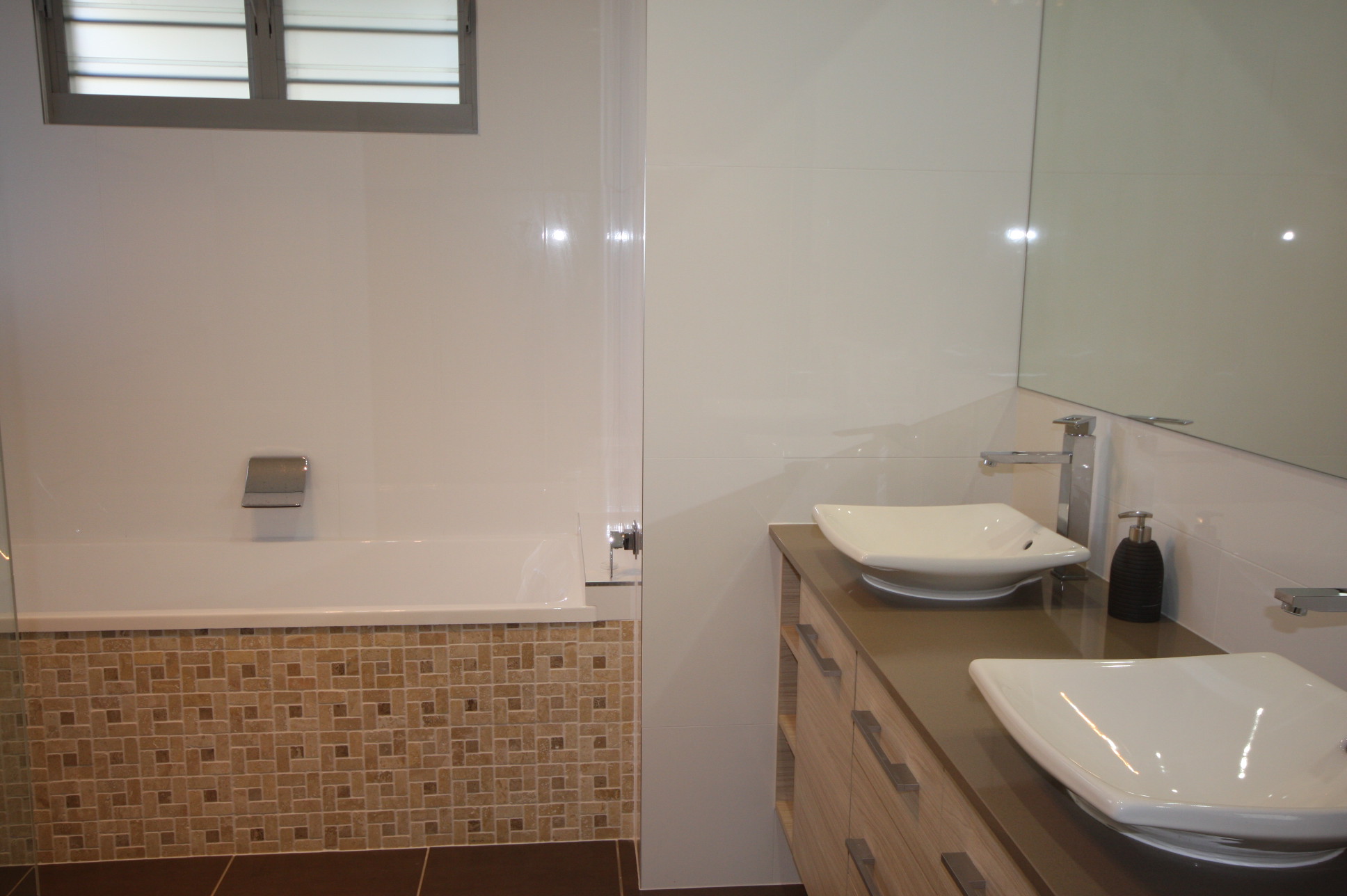 BATHROOMS: The large bathroom downstairs has a modern shower, bathtub and twin vanity with a separate toilet and washroom.